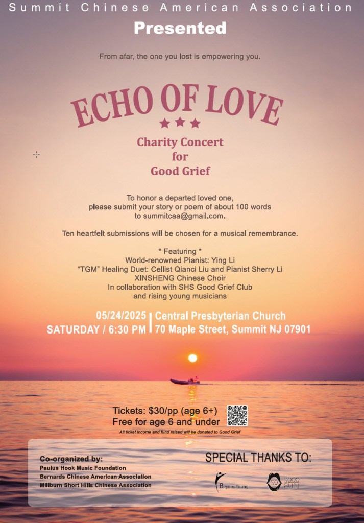 SUMMIT, NJ – May 24, 2025 – On the evening of May 24, 2025, at 6:30 PM, a moving music gala, the “Echo of Love” Charity Concert, unfolded at Summit’s Central Presbyterian Church. Organized by the Summit Chinese American Association, this event showcased the community’s selfless generosity and remarkable artistic talent. All ticket proceeds were proudly donated to Good Grief, a New Jersey non-profit dedicated to continuously supporting children and families navigating the profound loss of loved ones.