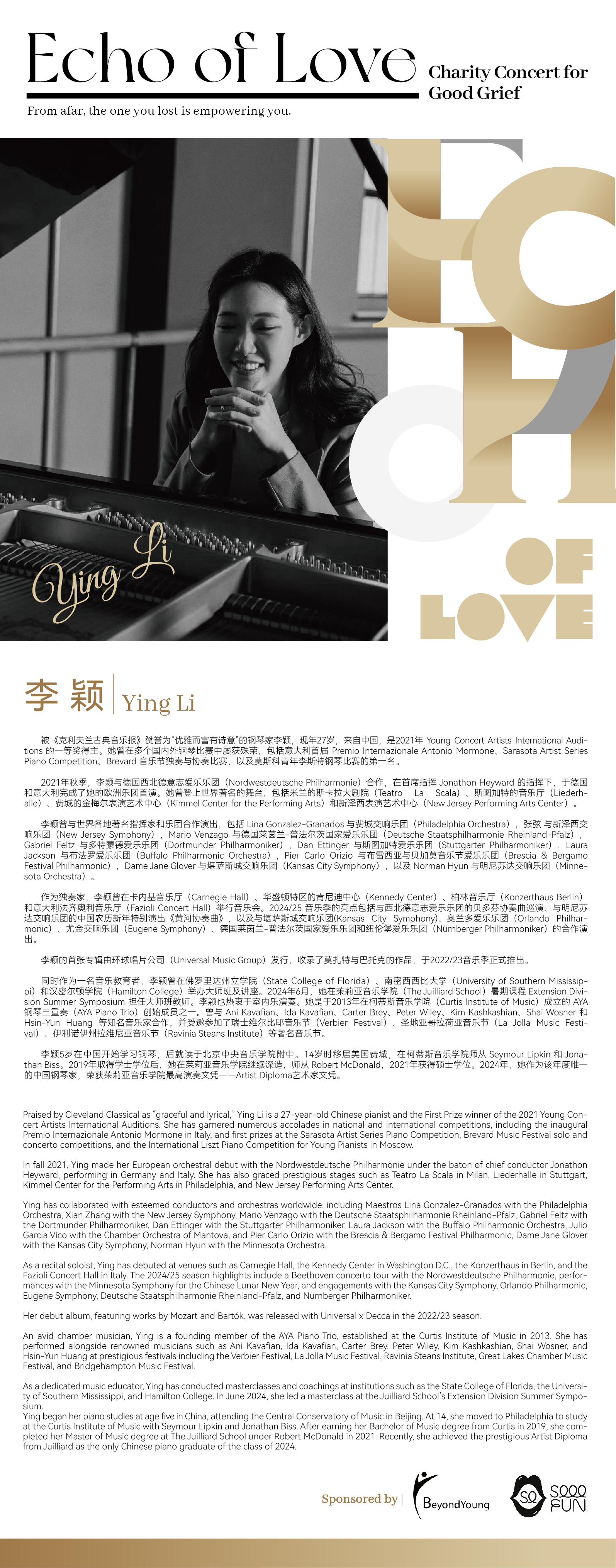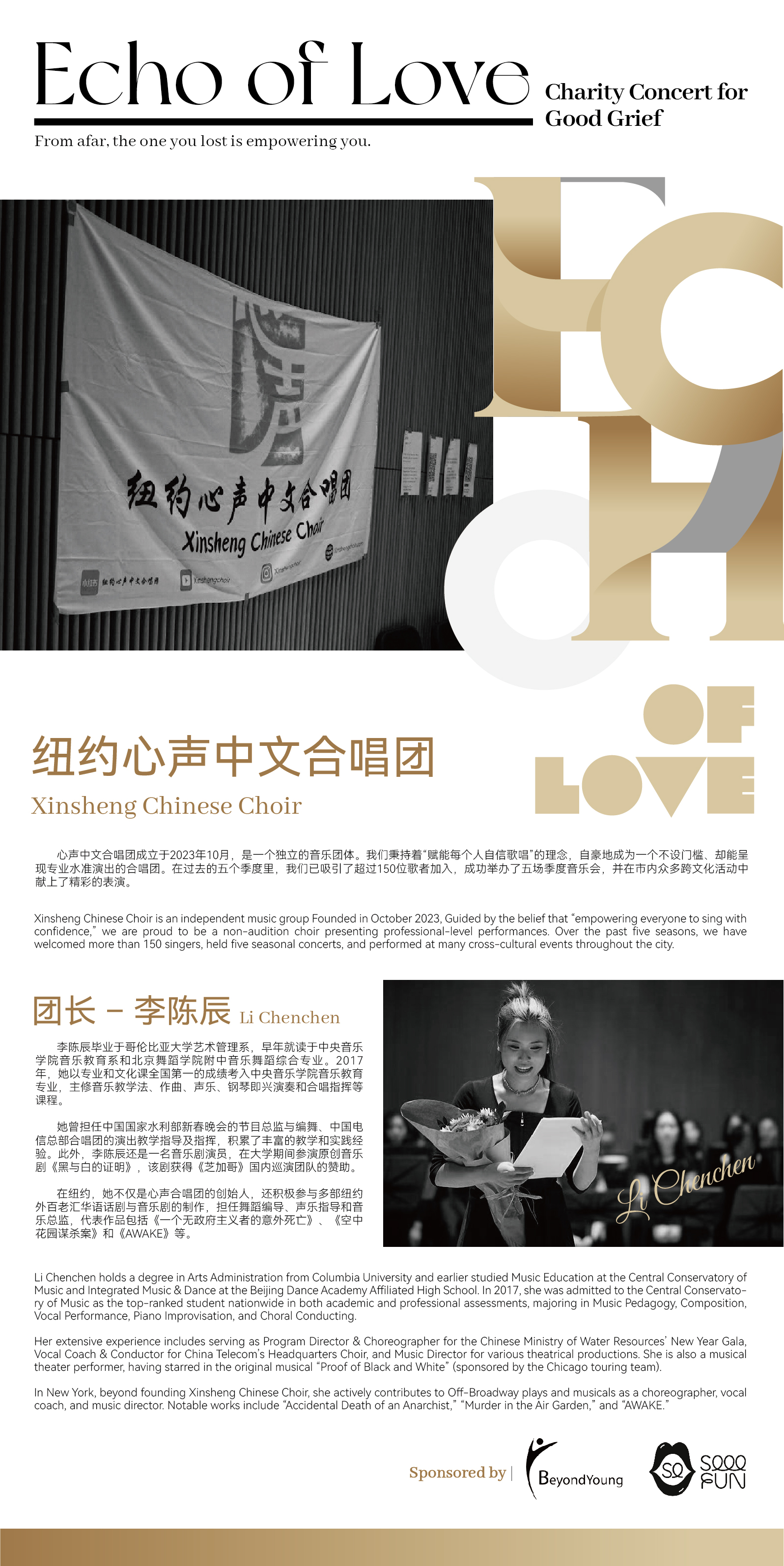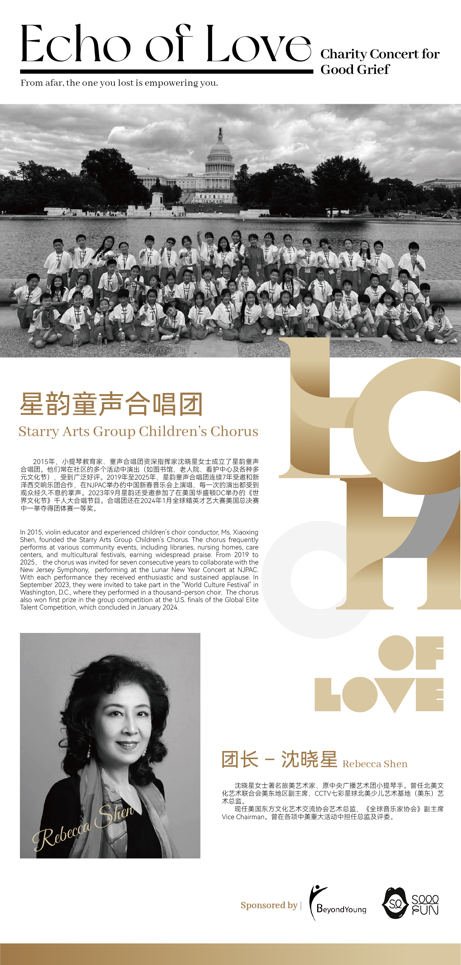 此次音乐会,Summit华人协会携手Millburn 和Basking Ridge两大华人协会,联合推广Good Grief和慈善音乐会。Millburn市长Annette Romano女士以及Millburn华协会长Jeslyn Li女士;知名华人企业家毕谦女士,陈栋先生,王超先生等,也亲临音乐会现场,以实际行动表达了对公益事业和社区互助的坚定支持,为活动增添了光彩。主办方Summit华协会长宋佳在音乐会结束时表示: ECHO OF LOVE,不仅是一场音乐会,更是一次心灵的拥抱,一次关于爱的回响。愿这种温暖的力量,持续回荡在人与人之间,跨越痛苦,走向希望。